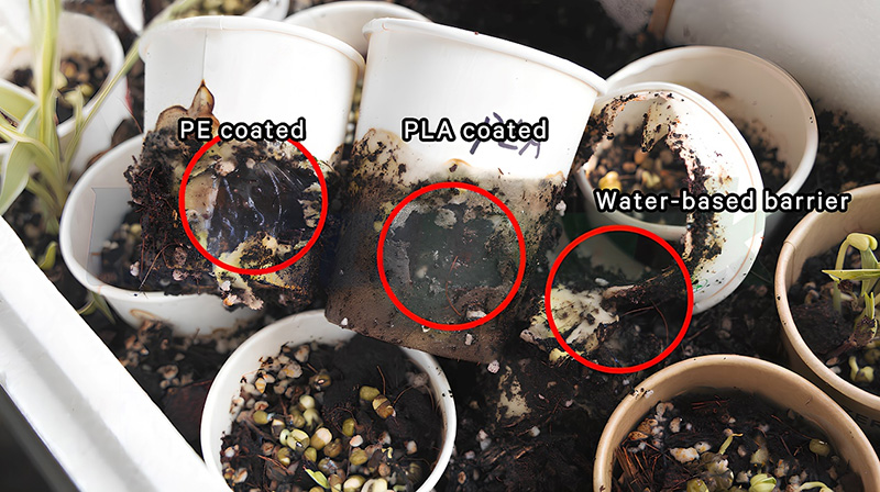 Ово су три различите врстепапирне шоље, направљен од ПЕ, ПЛА и воденог обложеног папира.